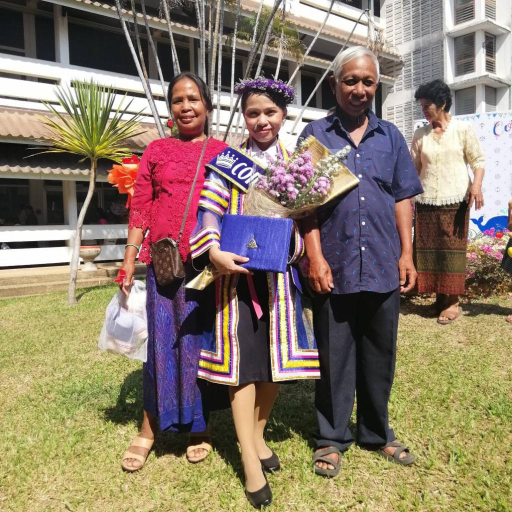 ด้าน คุณพ่อแหง ชินนะแสง กล่าวว่า วันนนี้เป็นอีกครั้งของความภูมิใจในความสำเร็จของลูกสาว ซึ่งนับว่าเป็นครั้งที่ 7 แล้วที่ตนได้กลับมาที่มหาวิทยาลัยอุบลราชธานี ตลอดเวลาที่เลี้ยงดูลูกทั้ง 8 คน ตนพยายามสอนลูกทุกคนเรียนรู้ในวิถีชีวิตความลำบากของอาชีพการทำนา การใช้ชีวิตเป็นอยู่แบบพอเพียง ใช้จ่ายอย่างประหยัด เท่าที่จำเป็น ในช่วงวัยเรียนเป็นอีกช่วงที่ลำบากมาก ทั้งค่าใช้จ่ายในการเรียนเพิ่มขึ้นต้องหยิบยืม หรือกู้เงินส่งลูกๆเรียน ไม่เคยให้คำแนะนำลูกว่าควรเรียนด้านใด ไม่เคยกำกับใส่ใจลูกเรื่องการอ่านหนังสือ ไม่เคยให้ลูกเรียนพิเศษใดๆ และไม่เคยรู้ว่าเกียรตินิยมคืออะไร รู้เพียงอย่างเดียวว่าอยากให้ลูกๆทุกคนได้เรียนหนังสือสูงๆ เติมเต็มในส่วนที่หายไปที่ตนในชีวิตที่ผ่านมา ซึ่งพ่อกับแม่มีความรู้เพียงแค่ชั้น ป.4 ภูมิใจที่ลูกทุกคนหาเลี้ยงชีพตนได้ และเป็นคนดีของสังคม หยาดเหงื่อของพ่อกับแม่ทุกหยดคือพลังสู่ความสำเร็จของลูกในวันนี้ ขอบคุณ มหาวิทยาลัยอุบลราชธานี ที่ให้โอกาสทางการศึกษาแก่ลูกๆทุกคนมาโดยตลอด คุณพ่อแหง ชินนะแสง กล่าว