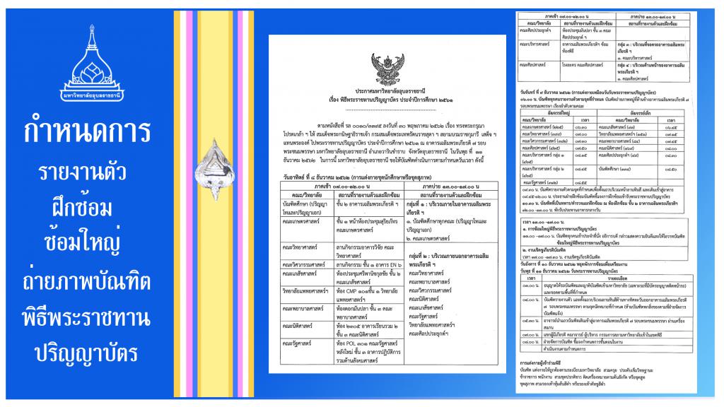 กำหนดการ รายงานตัวและฝึกซ้อมบัณฑิต พิธีพระราชทานปริญญาบัตร มหาวิทยาลัยอุบลราชธานี ปีการศึกษา2561