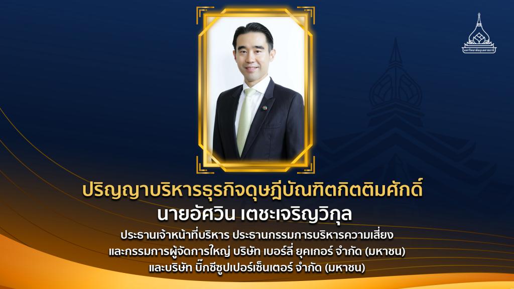 ปริญญาบริหารธุรกิจดุษฎีบัณฑิตกิตติมศักดิ์ ได้แก่ นายอัศวิน เตชะเจริญวิกุล ประธานเจ้าหน้าที่บริหาร ประธานกรรมการบริหารความเสี่ยง และกรรมการผู้จัดการใหญ่ บริษัท เบอร์ลี่ ยุคเกอร์ จำกัด (มหาชน) และบริษัท บิ๊กซีซูปเปอร์เซ็นเตอร์ จำกัด (มหาชน)เป็นผู้ที่มีความเชี่ยวชาญด้านวิชาการ มีผลงานวิจัยและการถ่ายทอดเทคโนโลยีด้านการบริหารธุรกิจเป็นผู้บำเพ็ญตนเป็นประโยชน์แก่ชุมชน สังคมทั้งในและต่างประเทศ ให้การสนับสนุน ส่งเสริมด้านการศึกษา ศาสนาและวัฒนธรรม โดยเฉพาะผู้ด้อยโอกาสในสังคม และมีบทบาทสำคัญในการสร้างความร่วมมือกับมหาวิทยาลัยอุบลราชธานีอย่างต่อเนื่อง ภายใต้การลงนามบันทึกข้อตกลงความเข้าใจ (MOU) สนับสนุนการวิจัย การบริการวิชาการ และการฝึกวิชาชีพและประสบการณ์การทำงานในการฝึกงานของนักศึกษา