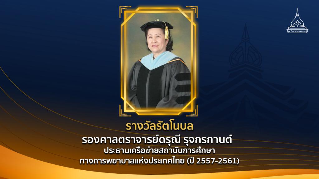 รางวัลรัตโนบล ได้แก่ รองศาสตราจารย์ดรุณี รุจกรกานต์ ประธานเครือข่ายสถาบันการศึกษาทางการพยาบาลแห่งประเทศไทย (ปี 2557-2561) เป็นผู้ที่มีความเชี่ยวชาญด้านโรคเอดส์โดยเฉพาะด้านการควบคุมและป้องกันโรคเอดส์ในภาคตะวันออกเฉียงเหนือ เป็นผู้มีส่วนร่วมสำคัญในการจัดตั้งคณะพยาบาลศาสตร์ มหาวิทยาลัยอุบลราชธานี และจัดทำหลักสูตรพยาบาลศาสตรบัณฑิต จนผ่านการรับรองจากสภาการพยาบาล และเป็นผู้มีส่วนร่วมที่สำคัญในการจัดทำคำของบประมาณเพื่อผลิตพยาบาลเพิ่มเพื่อเสนอต่อคณะรัฐมนตรีจนได้รับการสนับสนุนงบประมาณอย่างต่อเนื่อง นอกจากนี้ยังเป็นกรรมการผู้ทรงคุณวุฒิของคณะกรรมการพิจารณากลั่นกรองหลักสูตรของสภามหาวิทยาลัยอุบลราชธานีอย่างต่อเนื่องจนถึงปัจจุบัน